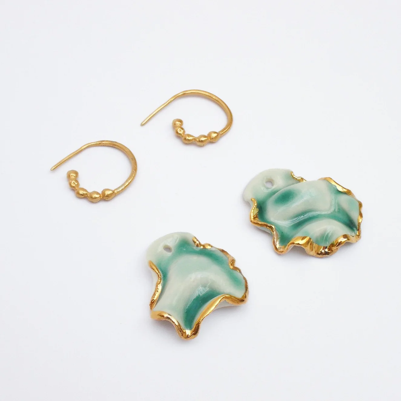 - Materials: White porcelain, transparent glaze, gold or platinum luster detail. Glaze is only applied on one side; the back of the earring presents the rough, natural porcelain characteristics.