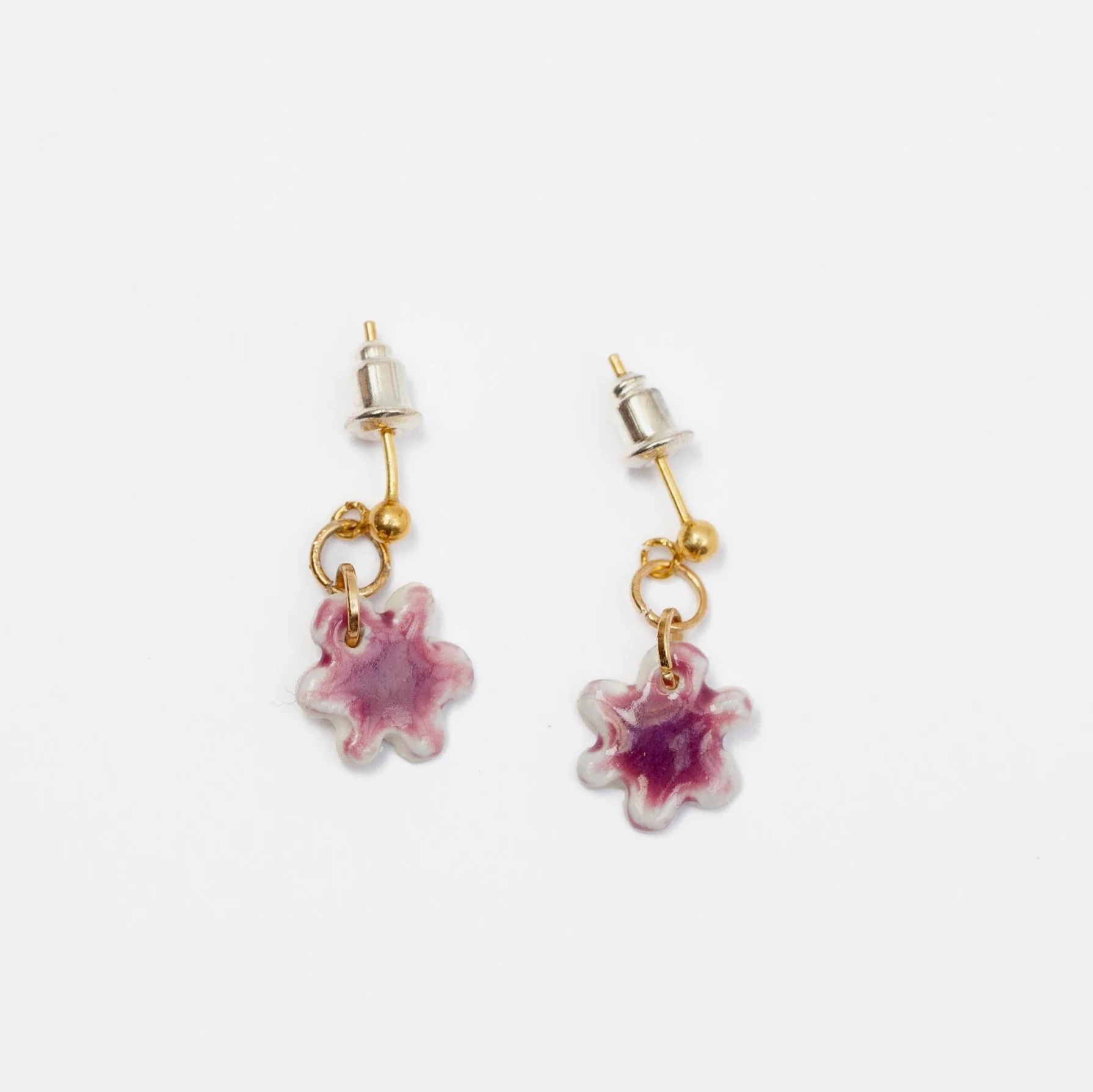 - Materials: White porcelain, transparent and colored glazes, gold or platinum luster detail. Glaze is only applied on one side; the back of the earring presents the rough, natural porcelain characteristics.