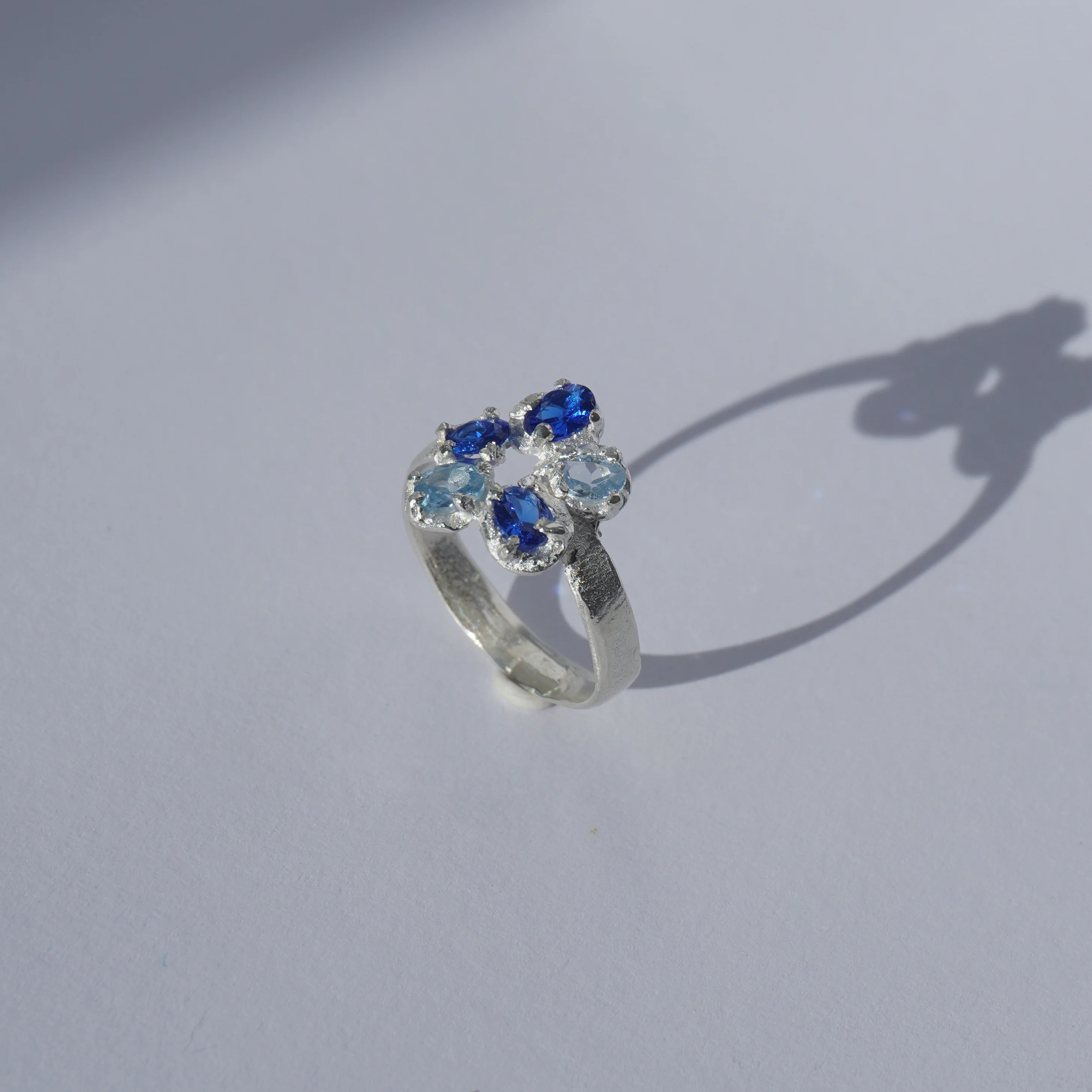 Ring featuring a subtle organic, sculpted band and five stones set into a flowered shaped.