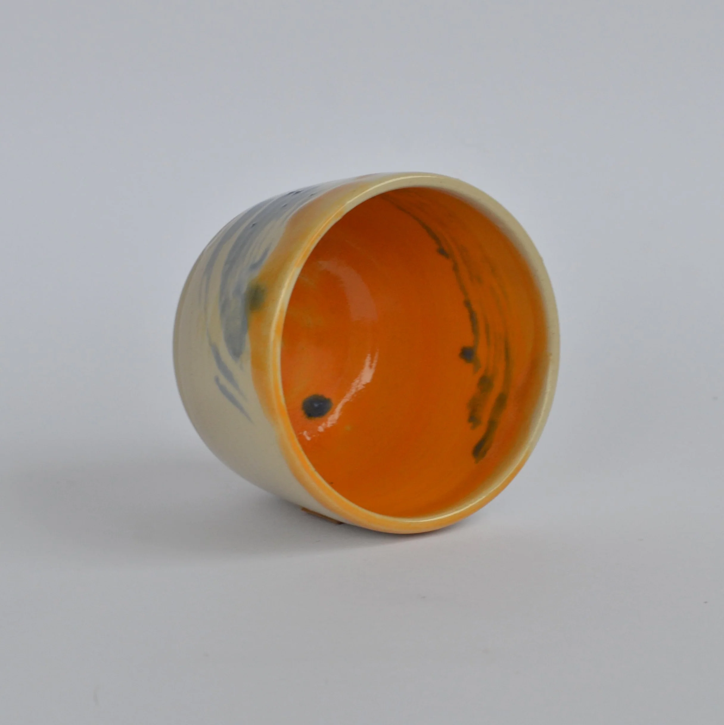 - Materials: White stoneware clay, covered in a transparent glaze, with blue touches on the outside and orage glaze inside.