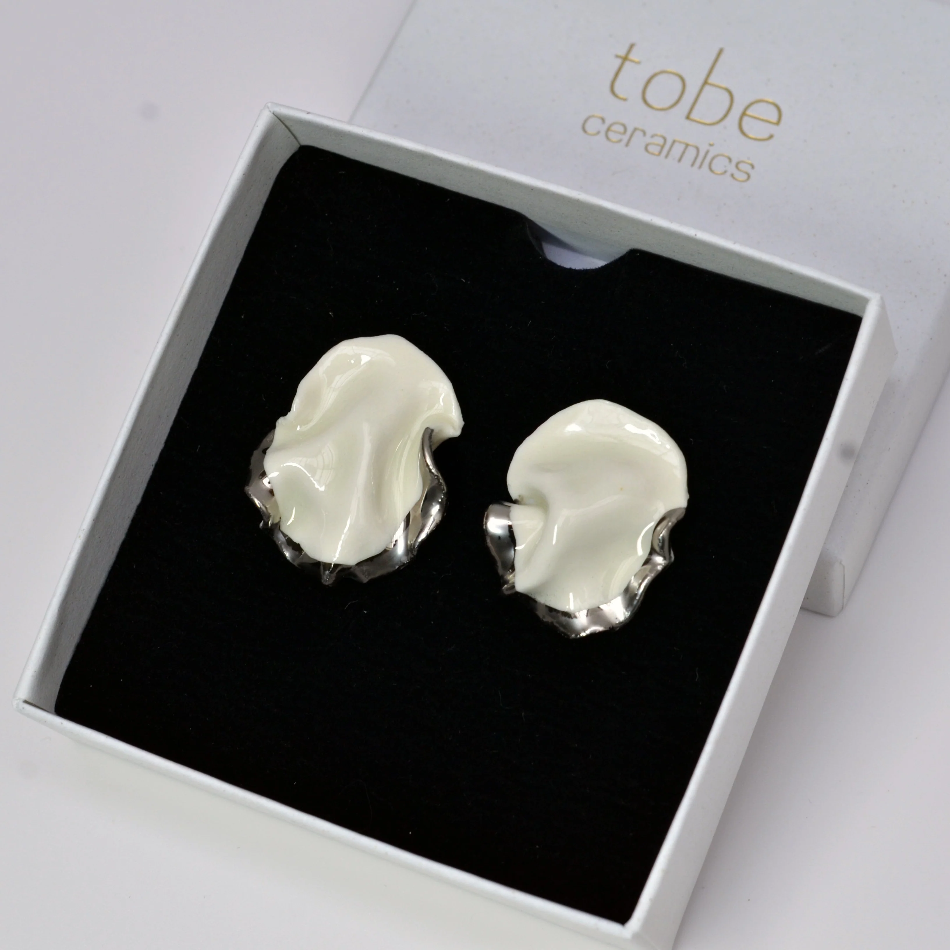 - Materials: White porcelain, transparent glaze, gold or platinum luster detail. Glaze is only applied on one side; the back of the earring presents the rough, natural porcelain characteristics.