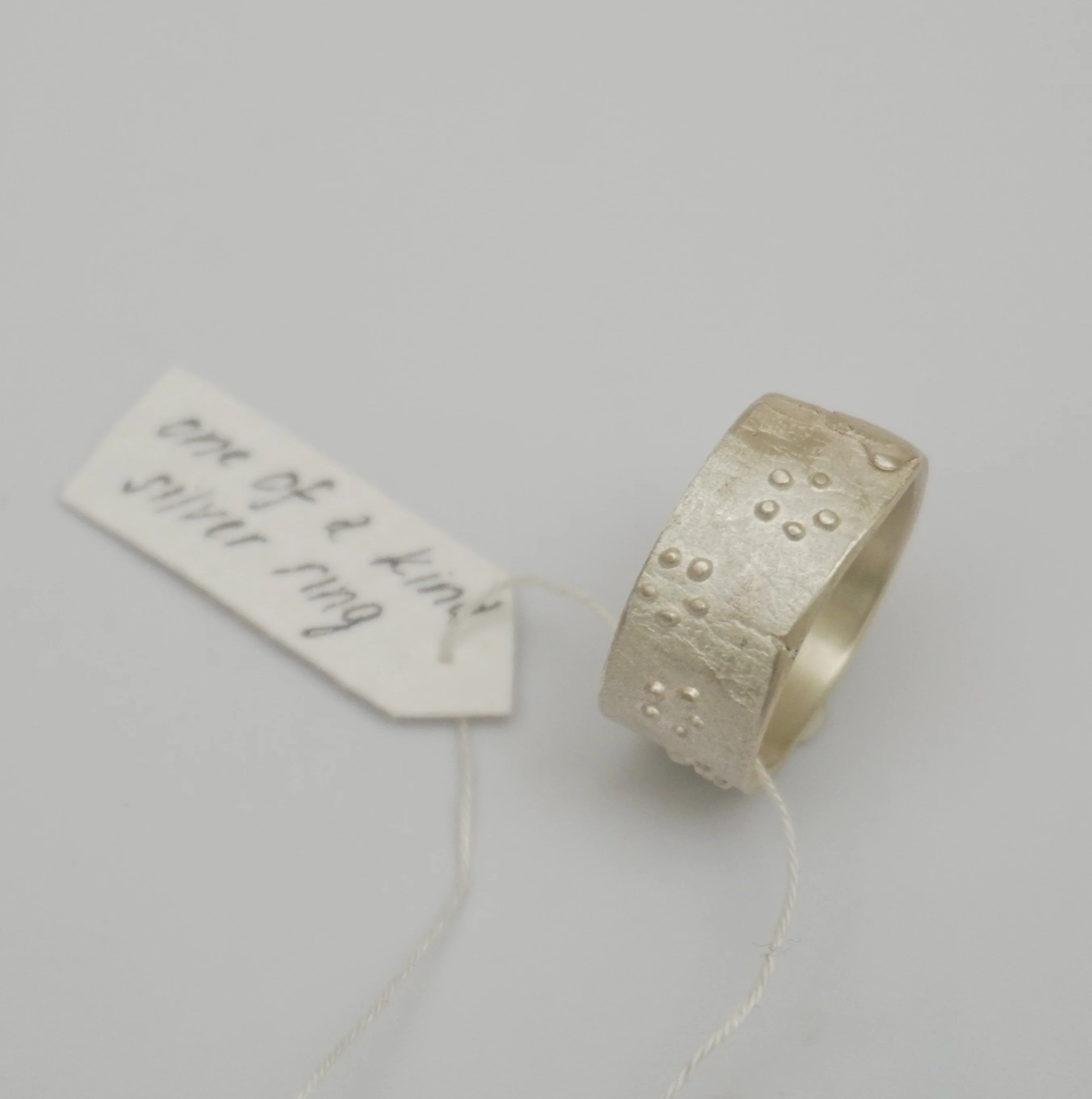 - Design: Handcrafted with a rough, textured band and dot detailing